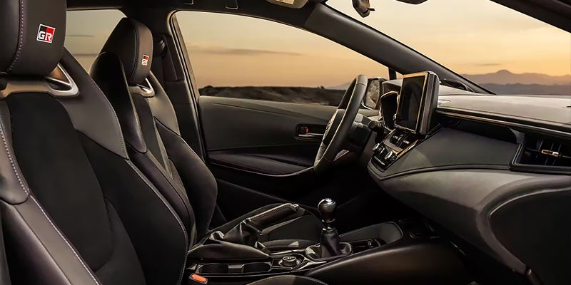 - The 2024 Toyota GR Corolla boasts high-performance sport seats, meticulously designed to provide exceptional support and comfort during spirited drives. These seats are adorned with the GR logo, reflecting the vehicle's racing heritage. Upholstered in premium materials, they offer a perfect blend of luxury and functionality, enhancing the overall driving experience.